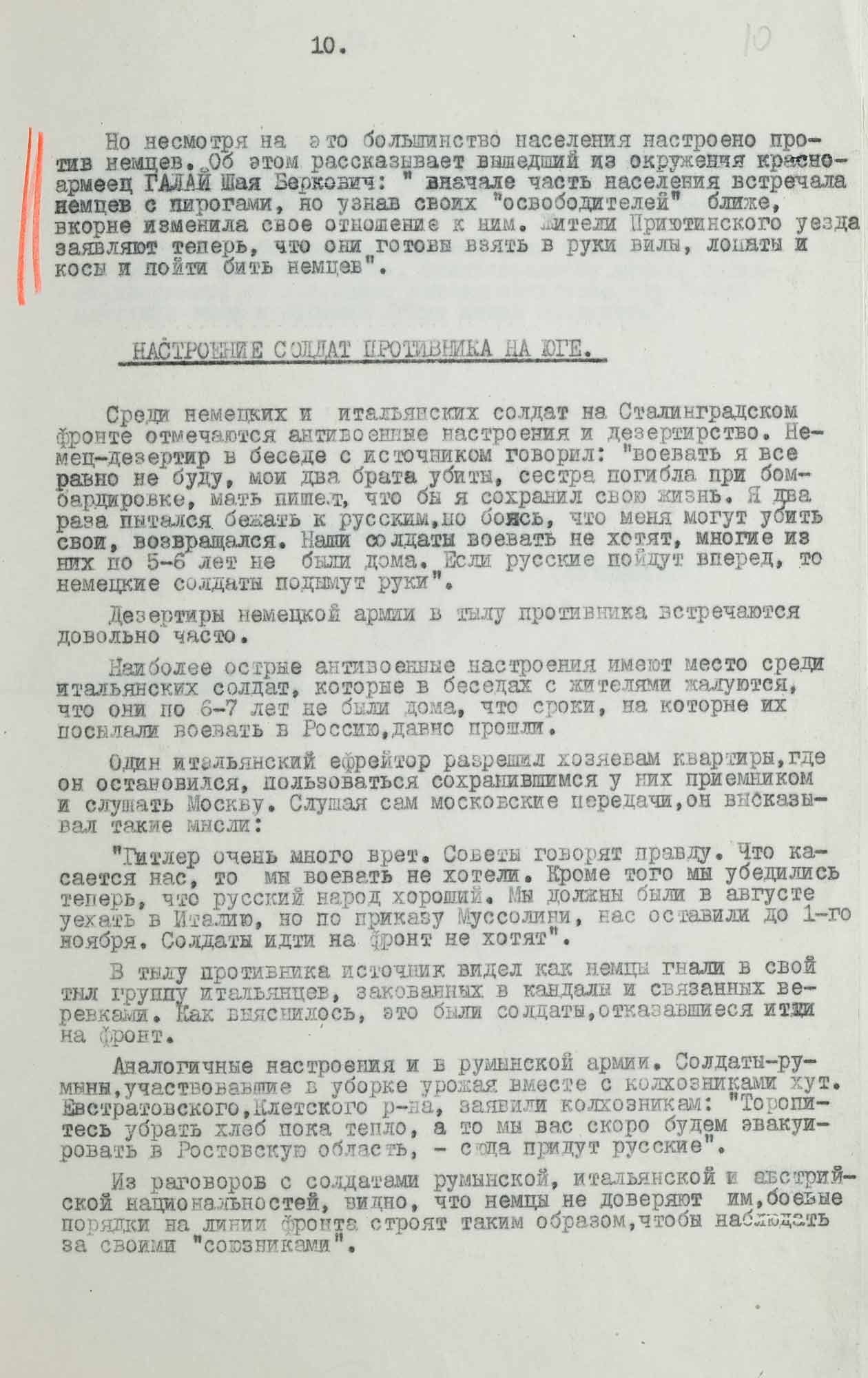 «Среди немецких и итальянских солдат на Сталинградском фронте отмечаются антивоенные настроения и дезертирство [...] Немец-дезертир в беседе с источником говорил: [...] Если русские пойдут вперед, то немецкие солдаты подымут руки [...]»