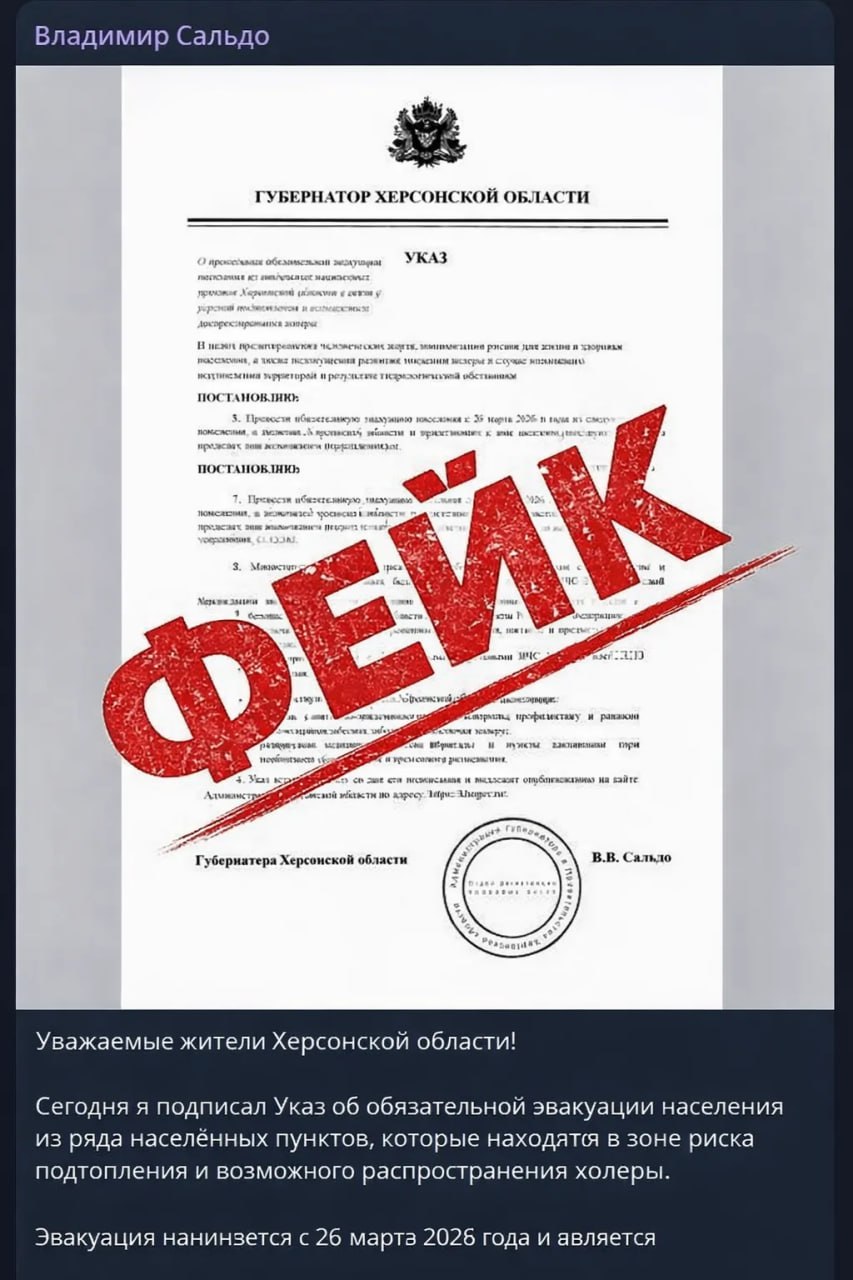 «Официально заявляю: это грубо сделанная подделка. Несоответствие формулировок, стилистики официальных документов и порядка принятия решений. Никаких указов об обязательной эвакуации в Херсонской области не издавалось. Гидрологическая и эпидемиологическая обстановка стабильная — угроз подтопления и холеры нет», — подчеркнул Сальдо в своём Telegram-канале.