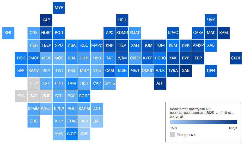 Вторую и третью строчку рейтинга, как и в 2024 году, занимают Ингушетия (37 преступлений на 10 тысяч жителей) и Дагестан (42 преступления на 10 тысяч жителей).