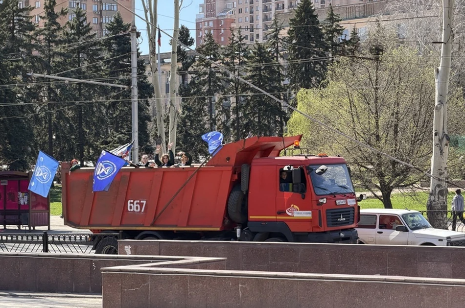 День провозглашения Донецкой Народной Республики встретили автопробегом. Инициаторы – командиры студенческих отрядов – подошли к делу творчески: по улицам Донецка проехала колонна автомобилей «КАМАЗ», украшенных флагами Российской Федерации, Донецкой Народной Республики и символикой студенческих отрядов.