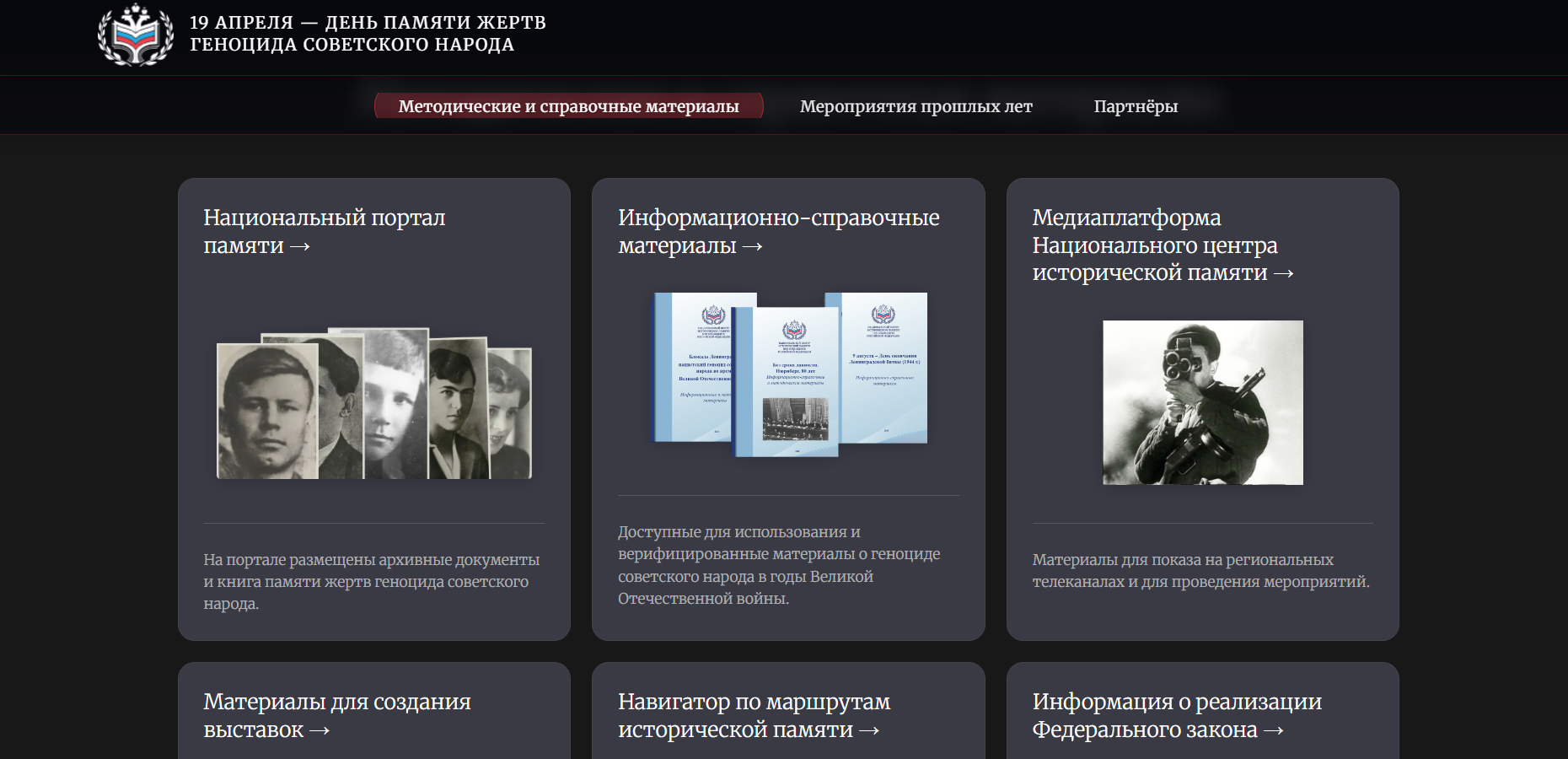 Национальный центр исторической памяти создал информационный ресурс, посвященный Дню памяти жертв геноцида советского народа, совершенного нацистами и их пособниками. Памятная дата назначена на 19 апреля, сообщается в Telegram-канале организации.