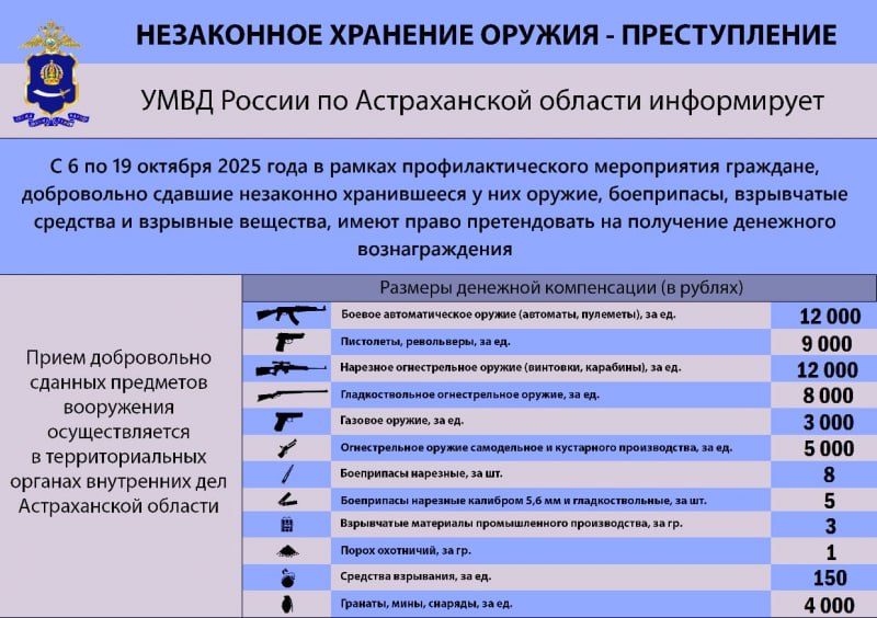 «На территории Астраханской области в период с 6 по 19 октября 2025 года будет проходить профилактическая акция по добровольной сдаче населением незаконно хранящегося оружия. Граждане могут добровольно сдать незаконно хранящееся предметы в любом отделе полиции и получить денежное вознаграждение», – подчеркнули в ведомстве.